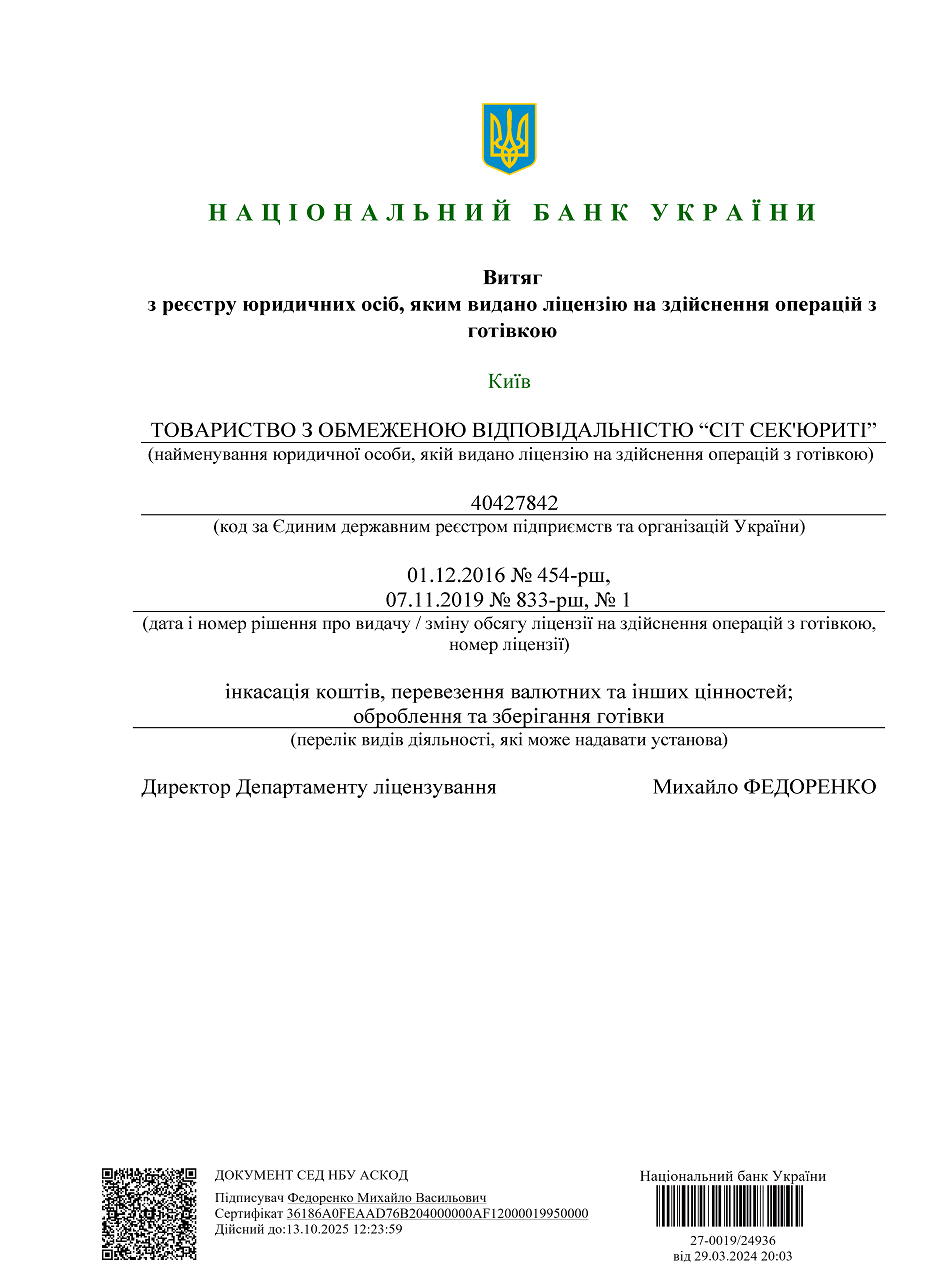 Компанія «СІТ СЕКʼЮРИТІ» – це перша приватна компанія в Україні, яка отримала ліцензію Національного банку України на надання послуг з інкасації.